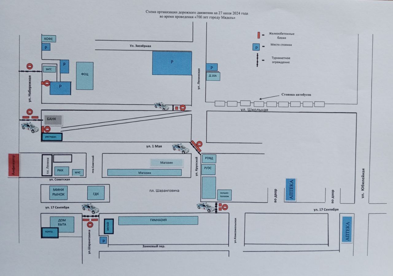 Схема организации дорожного движения на 27 июля 2024 года во время проведения праздничного мероприятия к 700 -летию города Мяделя