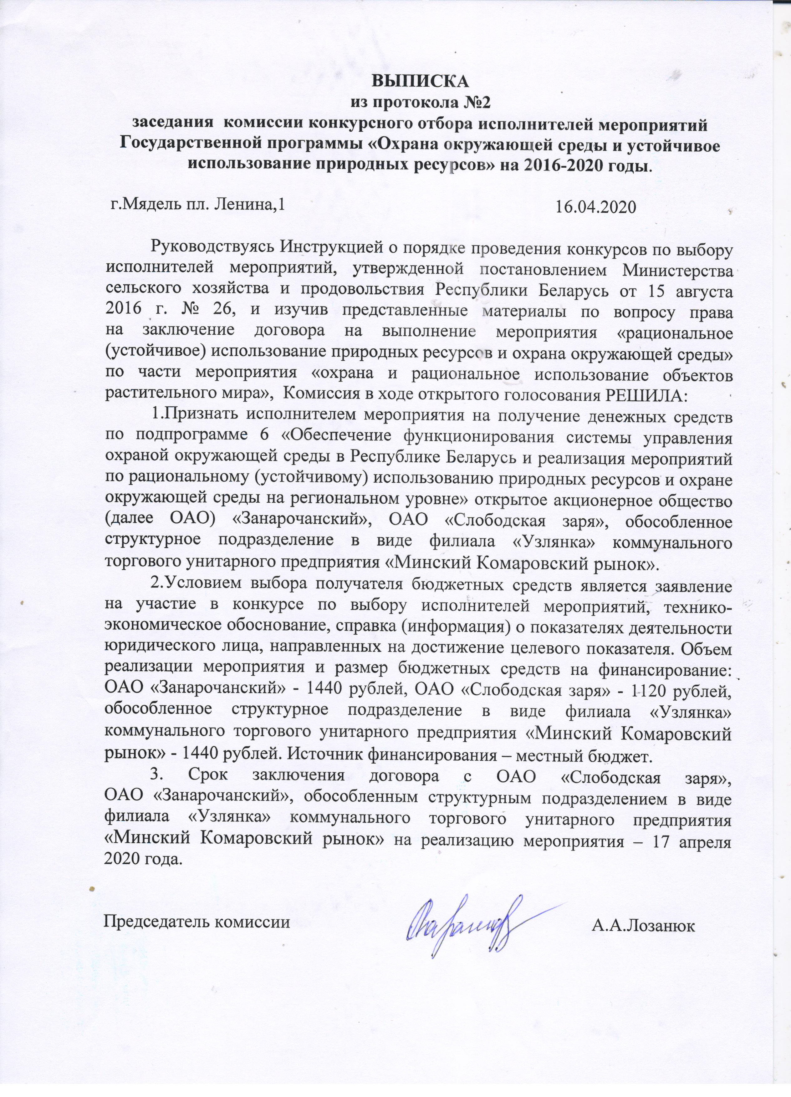 Выписка из протокола №2 заседания комиссии конкурсного отбора исполнителей мероприятий Государственной программы «Охрана окружающей среды и устойчивое использование природных ресурсов» на 2021-2025 годы