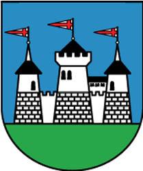 Описание герба г.Мядель: в голубом поле на зеленом основании серебряный замок о трех башнях, соединенных зубчатыми стенами. На башнях вымпелы с крестами Св. Георгия.